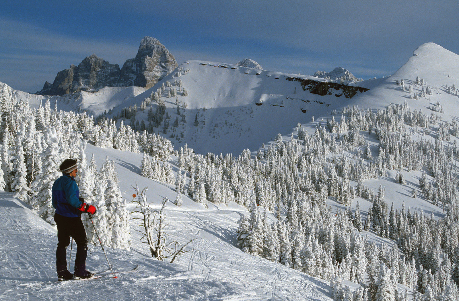 DAVE GOODMAN, MT OWEN, GRAND TETON, THE TOP OF MIDDLE TETON, PROBABLY SOUTH TETON AND MARY'S NIPPLE SEEN FROM GRAND TARGHEE SKI AREA