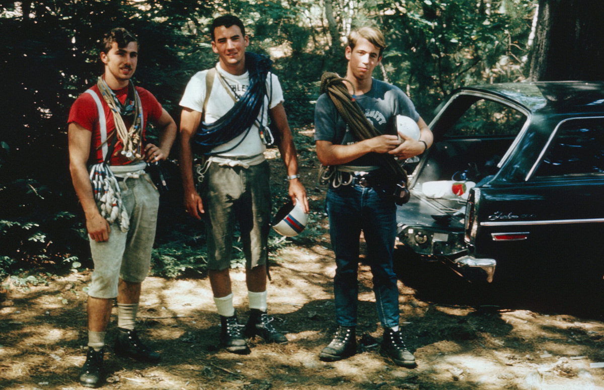 Rick Wilcox, Chip Cole and Peter Cole at the base of Cathedral Ledge - summer 1968. We're all geared up to do the Standard Route. One new perlon rope and one 'goldline' over my shoulder. On the route we would all be wearing Limmer boots. Photo by Ken Schory